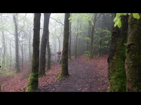 Less than a mile from the cottage I was staying in is the Raven Trail at Brechfa. Connected to the Gorlech trail I rode last summer, this starts from a different point and offers a tougher, black-rated challenge. Compared to the red trails this went more directly straight up a load of climbing, dropping back on trails that pushed to the top of what might usually be red-rated at least. So, fun swoopy bermed drops, roots, rock drops, and steep climbs were the order of the day, as we rose and fell into the cloud and the rain.